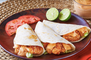 Ingredienser: 12 st stora räkor utan huvud, 1,1 dl brödsmulor, 3 msk malda jordnötter, 2 msk mjöl, 1 vispat ägg, 1,1 dl majonnäs, 1 burk La Costeña Chipotle chili i Adobo sås, tortillas. Instruktioner: 1. Skala räkorna och dela dem i två. Blanda brödsmulorna med jordnötterna. 2. Vänd räkorna i mjöl, ägg och brödsmulor. Stek dem i varm olja tills de är frasiga och har fått en jämn gyllenbrun färg. 3. Blanda majonäsen med Chipotlen. 4. Värm tortillas och fyll dem med sallad, räkorna och såsblandningen.