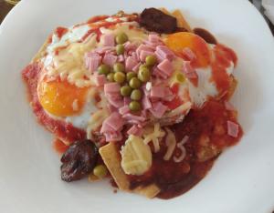 Ingredienser: friterad majstortilla, ägg, svarta bönröra, tomat sås, ost, ärtor och skinka, stekt banan, salt till smak.