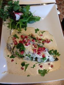 Såsen: Koka valnötterna i vatten i 5 minuter och skala mandlarna. Blanda valnötter och mandlar i mixern med alla andra såsingredienser. Såsen ska bli tjock. Ställ såsen i kylen. Häll den över chillin och strö granatäpplefrön och hackad persilja ovanpå.