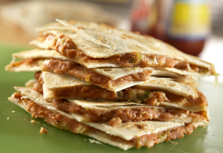 Ingredienser: 1 matsked solrosolja, 1 st gul lök, finhackad, 2 klyftor vitlök, finhackade, 1 tsk kumminfrö, 400 g bönröra (svarta eller bruna bönor), 2 tsk paprikapulver, 8 majstortillas, 100 g cheddar eller annan lättsmält ost, koriander, 200g röd salsa casera, crème fraiche. Instruktioner: 1) Fräs den gula löken i solrosoljan i en stor panna på spisen. När löken är genomskinlig, tillsätt vitlöken och låt fräsa i ytterligare några minuter. 2) Tillsätt bönorna och låt fräsa tillsammans i 4-6 minuter. Blanda hela tiden så att inget bränner fast. 3) Värm upp några tortillas och fyll dem med osten och bönorna. Vik den på hälften och ta bort den från värmen när osten är smält. 4) Servera med créme fraîche, green eller röd sås.