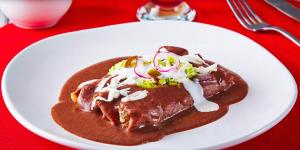 Ingredienser: 2 st kycklingbröst (400 g), 9 st majstortillas från Nagual, 1 hel bit, röd mole i Rogelio Bueno sås, 4 msk sallad (valfri), 1,1 dl gul lök, 1,1 dl crème fraiche, 4 msk strimlad mozarella, 1 ¼ msk salt 1,1 dl olivolja , peppar efter smak. Instruktioner: 1. Koka kycklingen (utan skinn) i vatten med saltet i 20 minuter. Rör med jämna mellanrum bort bubblorna som lägger sig under tiden kycklingen kokar. Häll ut spadet när kycklingen är färdigkokt. 2. Skiva salladen och löken i tunna skivor. Värm upp olja i en stekpanna och stek varje tortilla några sekunder på var sida, men inte så länge att de blir frasiga. Lägg varje tortilla på en bit papper för att suga upp överflödig olja. 3. Värm molen i en liten skål. Doppa tortillasen i molen, lägg kycklingen på dem och vik ihop dem som en taco. 4. Häll på ännu mer röd sås, tillsätt crème fraiche, salladen och löken. Strössla över ost som garnering. Serveras varm.