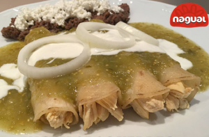 Ingredienser: 0,5kg fläsk skuldra, 2 poblano pepparfrukter, 1 lök, 3 vitlöksklyftor, 1/3 kopp färsk koriander, 1/4 kopp tjock grädde, salt och peppar, 10 majstortillas, 1/4 kopp stekolja, tärnade tomateroch gräslök för garnering. Instruktioner: 1. Lägg fläsket i en gryta med tillräckligt mycket vatten i för att täcka den och koka med salt i ungefär 20 minuter. 2. Blanda poblano pepparfrukterna, löken, koriandern och vitlöken med 1 kopp vatten, i en bunke. När du blandat ingredienserna och format en slät sås- häll det i den kokande fläskgrytan. Låt sjuda i ungefär 10-15 minuter, eller tills fläsket är genomkokt. Ta ut fläsket och låt svalna. 3. Häll i grädden i såsen, justera kryddningen efter smak, sätt spishettan på låg och låt sjuda i 25 minuter-under konstant omrörning. 4. Skär fläsket i strimlor eller i väldigt små kuber. 5. Hetta upp olja i en stekpanna tills pannan är väldigt varm, snabbstek varje tortilla en för en Max 5-10 sekunder! Det är viktigt att de inte blir för frasiga. 6. Fyll varje tortilla med fläsk, rulla ihop och lägg på en tallrik. Häll lite poblanosås ovanpå och garnera med gräddfil, gräslök och tomater. *Receptet är från whatscookingmexico.com