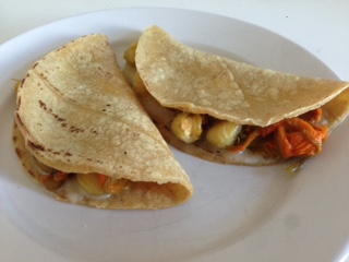 Ingredienser: 500 g potatis (skalad och tärnad), 1 tsk kummin, 1 tsk chilipulver, 1 tsk salt, 1 tsk ketchup, 500 g gröna tomater (tomatillos), 1 lök, 1 knippe koriander, 16 st majstortillas, 1 burk hela bruna bönor, 375 g färskost, vegetabilisk olja