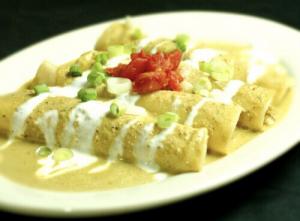 Ingredienser: 12 st majstortillas från Naugal, 2 st kycklingbröst (600 g), 1 bruk Grön sås Clemente Jacques, 1 medelstor gul lök , 1,1 dl gräddfil, 4 msk riven ost, 2,25 dl vegetabilisk olja , 1 burk svart bönröra från La Sierra, salt och peppar efter smak.