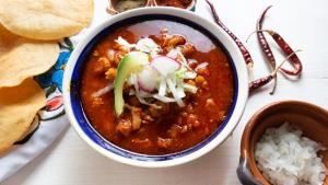 8. Servera pozolen på en djup tallrik och lägg garneringen ovanpå.