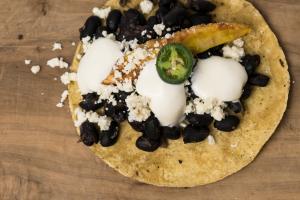 Stekt Majstortillas med mexikanska refried beans, kaktus nopal, grön sås/röd mexikansk sås, sallad, feta ost och creme fraiche.