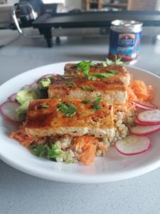 Ingredienser: 1 msk. quinoa, 0,5 msk färsk koriander, 3 msk. limejuice, 1 msk. + 2 tsk honung, 1/3 msk. + 1 msk. olivolja, 2 tsk chipotle sås, 400 gr. tofu, 1 tsk kummin, 2 morötter, riven, 4 rädisor, tunt skivad, 1 avokado, tunt skivad.
