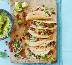 För guacamolen: 1 liten vitlöksklyfta, 2 mtsk grovhackad koriander, 1 grön chilli, skivad, 2 avocados, halverade och urkärnade, juice 1 lime. För salsan: 110g packet granatäpplefrön, 1 grön chilli, fintärnad, 1 liten vitlök, fintärnad, en liten handfull färsk koriander, hackad, servera med 8-12 majstortillas, chipotle eller annan hot sauce, gräddfil eller kokosnötsyoghurt.