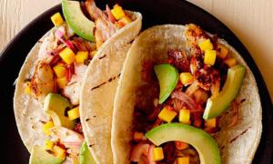 Tillagning: För att göra marinaden, mixa alla ingredienser (förutom fisken) noga med en stavmixer. Skärsedan fisken i skivor och lägg i dem i marinaden, och blanda försiktigt tills all fisk är täckt avmarinad. Ställ in marinaden med fisken i kylen och låt stå i ca en timme. Värm stekpannan och stek fisken. Använd marinaden som stekfett. Stek tortillorna i stekpannanpå båda sidor, tills de är alldeles hårda. Servera tortillorna med fisken. Strö över avokado, mango och vitkål.