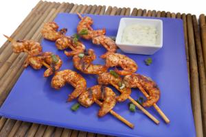 Ingredienser: 900 g räkor (skalade), 28 g El Yucateco Achiote, 1,1 dl ananasjuice, 2 msk vinäger, 3 vitlöksklyftor, 16 grillspett.